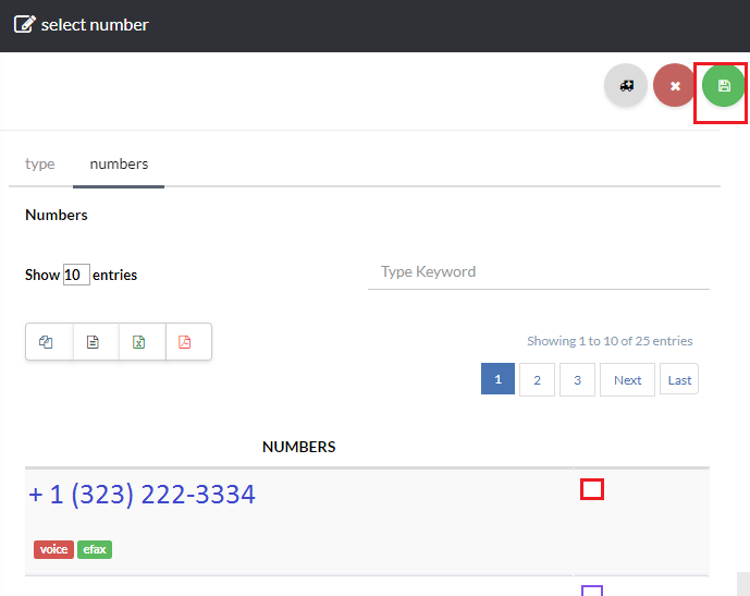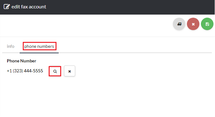 Now, click Phone Numbers and from here, you will be able to add, change, or remove a fax number.To change the fax number click the icon next to the number as shown in Exhibit 3a. You can choose to use a Existing or New number as shown in Exhibit 3b. Lastly, select your desired fax number and click save as shown in Exhibit 3c.