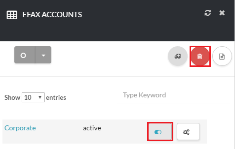To delete a Fax account click the switch icon located under Actions next to the Fax account you want to delete as shown in Exhibit 3. Next, click the trashcan icon that will appear to delete the Fax account.