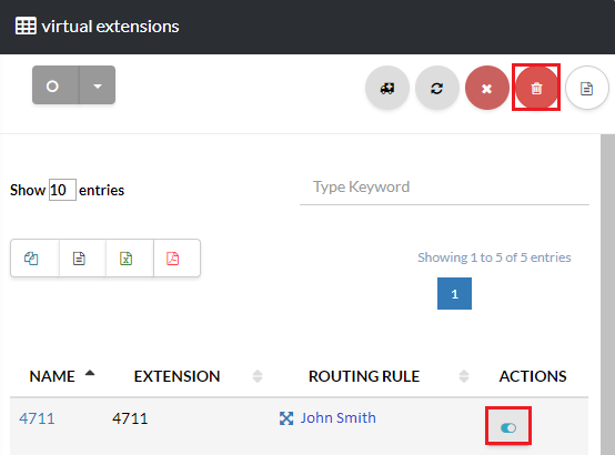 To delete a Virtual Extension click the switch icon located under Actions next to the Virtual Extension you want to delete as shown in Exhibit 3. Next, click the trashcan icon that will appear to delete the Virtual Extension.