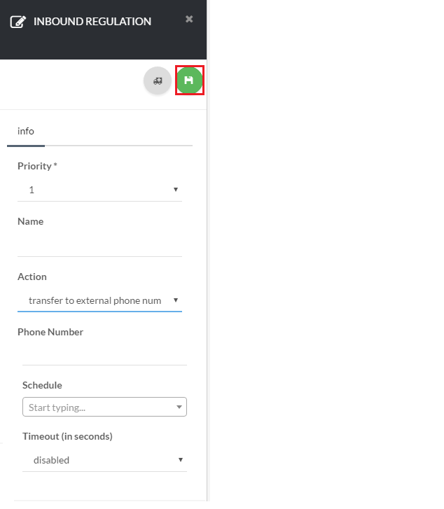 Now, under the Info section enter a descriptive name for your routing rule as shown in Exhibit 3a. Next, under the Advanced section you can override the outbound caller ID for all incoming calls using this routing rule as shown in Exhibit 3b. Click the save icon on the top right-hand side of the page as shown in Exhibit 3c.