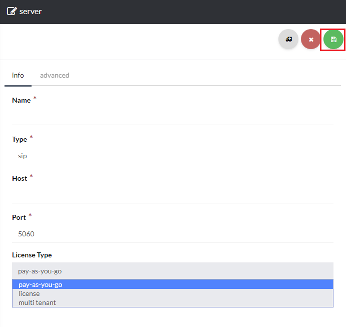 Provide the server information for the Info section. Click the save icon on the top right-hand side of the page once you are done as shown in Exhibit 2. For your convenience, a description of each field is given below: