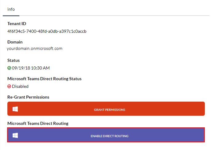 When provisioning has completed, your Microsoft Teams Direct Routing Status will change to “Enabled,” and you will receive an email with the status update. Click the Office 365 menu link again to refresh your provisioning status.
