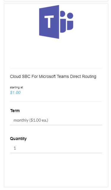 You will need to purchase a Circuit ID SBC License for each user in your organization you would like to enable for Microsoft Teams Direct Routing. Purchase the necessary licenses by navigating to the Store as shown in Exhibit 2a. Next, locate the Microsoft Teams Direct Routing license and select the Term and Quantity as shown in Exhibit 2b.