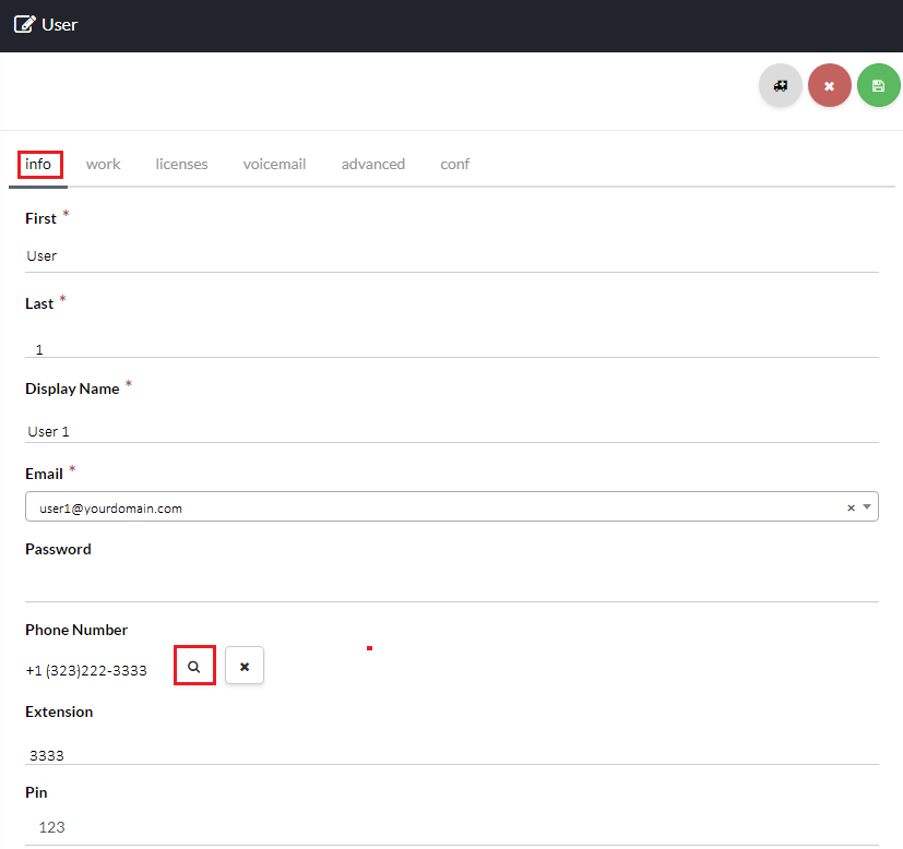 Now, go to the Info section of the users page and assign a phone number and extension as shown in Exhibit 6c. Click save once you are done.