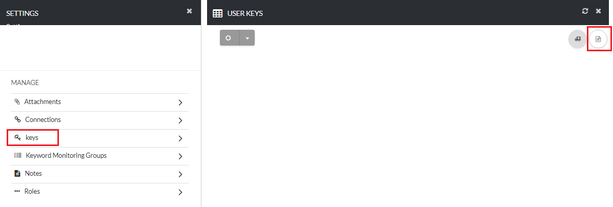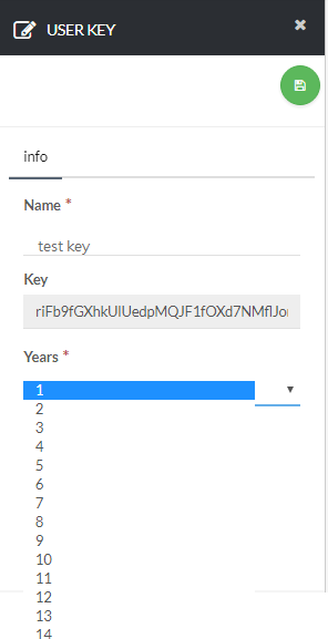 Next, click Keys and click the create icon on the top right-hand side of the page as shown in Exhibit 3a. Then, create a new user key by filling out all the fields under the Info tab as shown in Exhibit 3b. Once you are done click the save icon at the top right side of the screen as shown in Exhibit 3c. For your convenience, a description of each field is given below:Info