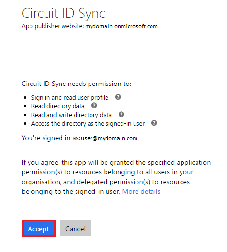 Now, select Existing from the drop down menu and click save as shown in Exhibit 3a. On the Circuit ID Sync page, log into your Office 365 account by entering your email address as shown in Exhibit 3b. Lastly, click Accept to complete the process as shown in Exhibit 3c.