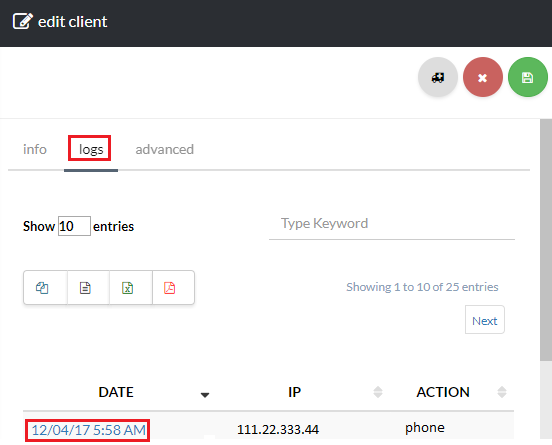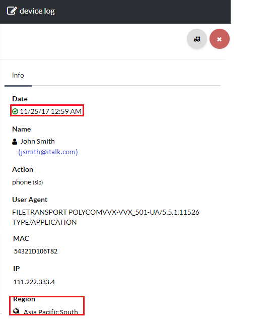 Navigate to Clients and click on the desired client as shown in Exhibit 3a. Now, click the Logs tab and select a log by clicking on the Date of the log as shown in Exhibit 3b. You can view information about your device on the device log page. If there is a green check mark the device is configured properly, you can also see what Region the client is assigned to as shown in Exhibit 3c