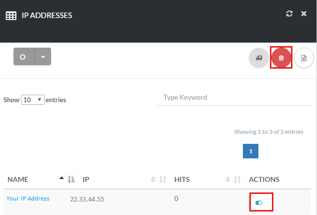 To remove an IP address click the slider bar under Actions next to the IP address and click the trash can icon at the top of the page [su_exhibit text=”4″].