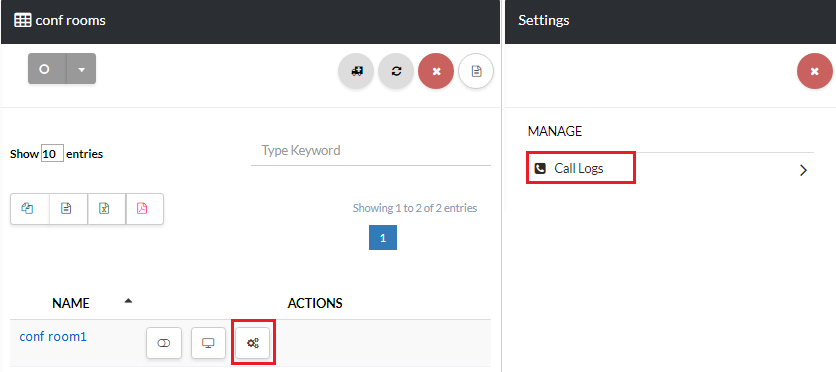 From the main menu click on Phone then select Conf Rooms [su_exhibit text=”4a”]. On the Conf Rooms page, click the gear icon under actions of your chosen conference [su_exhibit text=”4b”]. Lastly, you can view the CDR on the Call Logs page [su_exhibit text=”4c”].